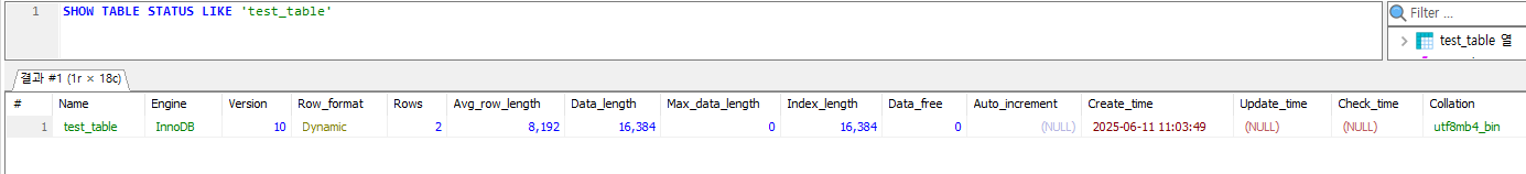 SHOW TABLE STATUS LIKE '{대상 테이블}'
