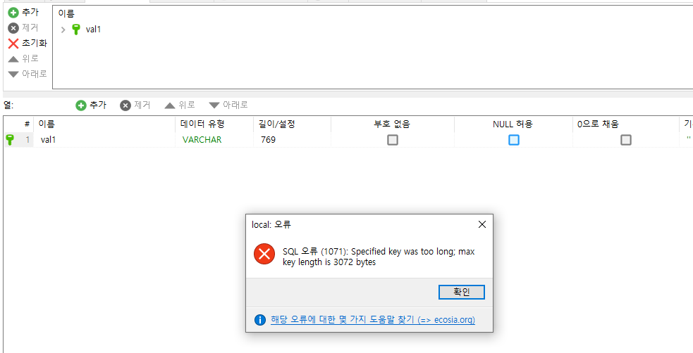 만약 이 상태에서 varchar(769) 로 변경하고 인덱스를 정의하려면 에러가 난다. 즉 앞서 계산한 공식인 3072 / 4 = 768 이 성립함을 알수 있다.